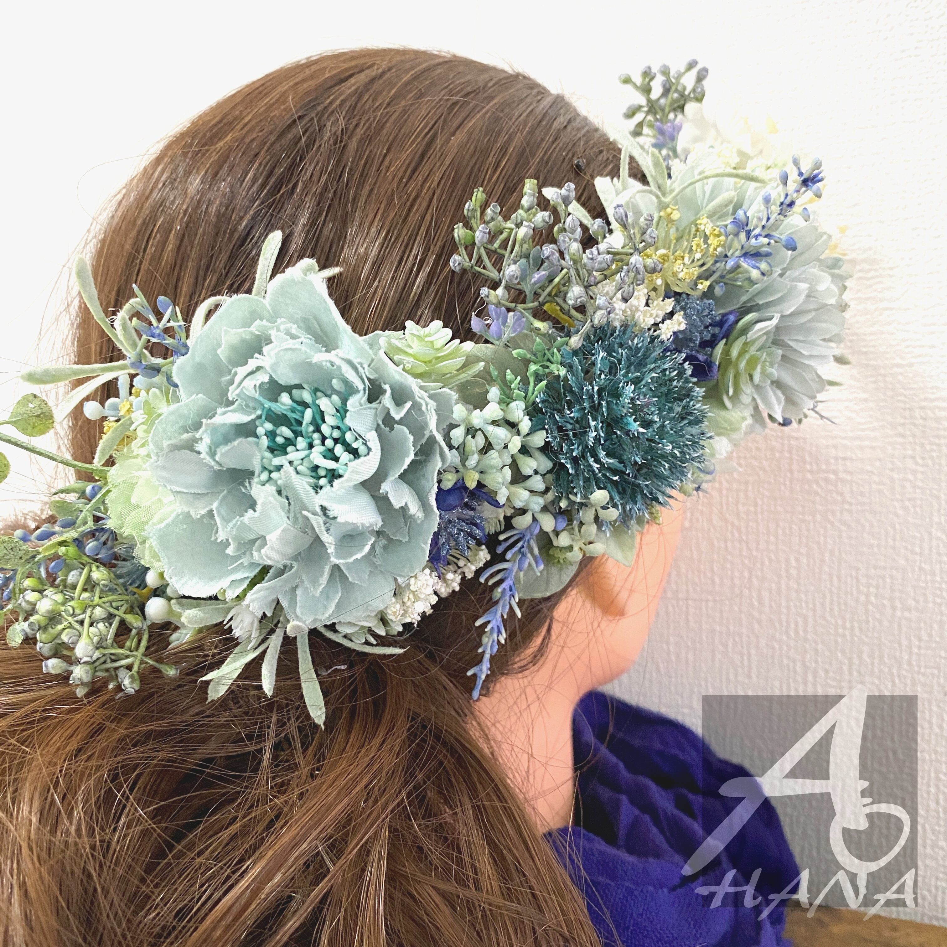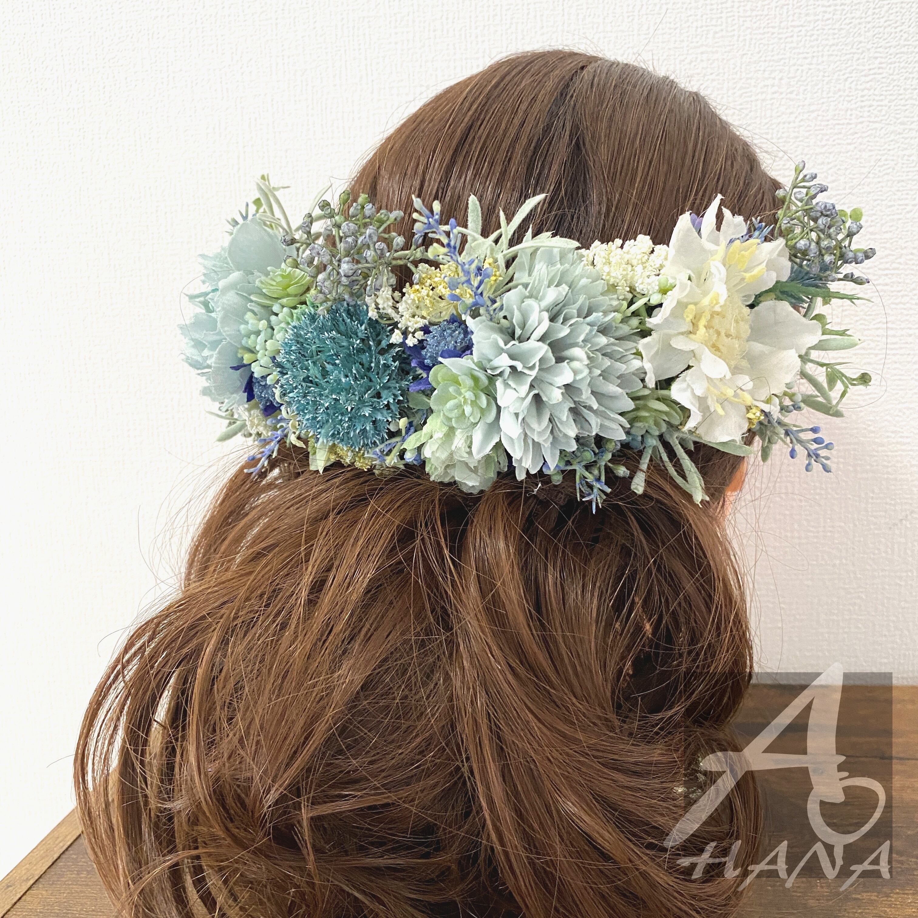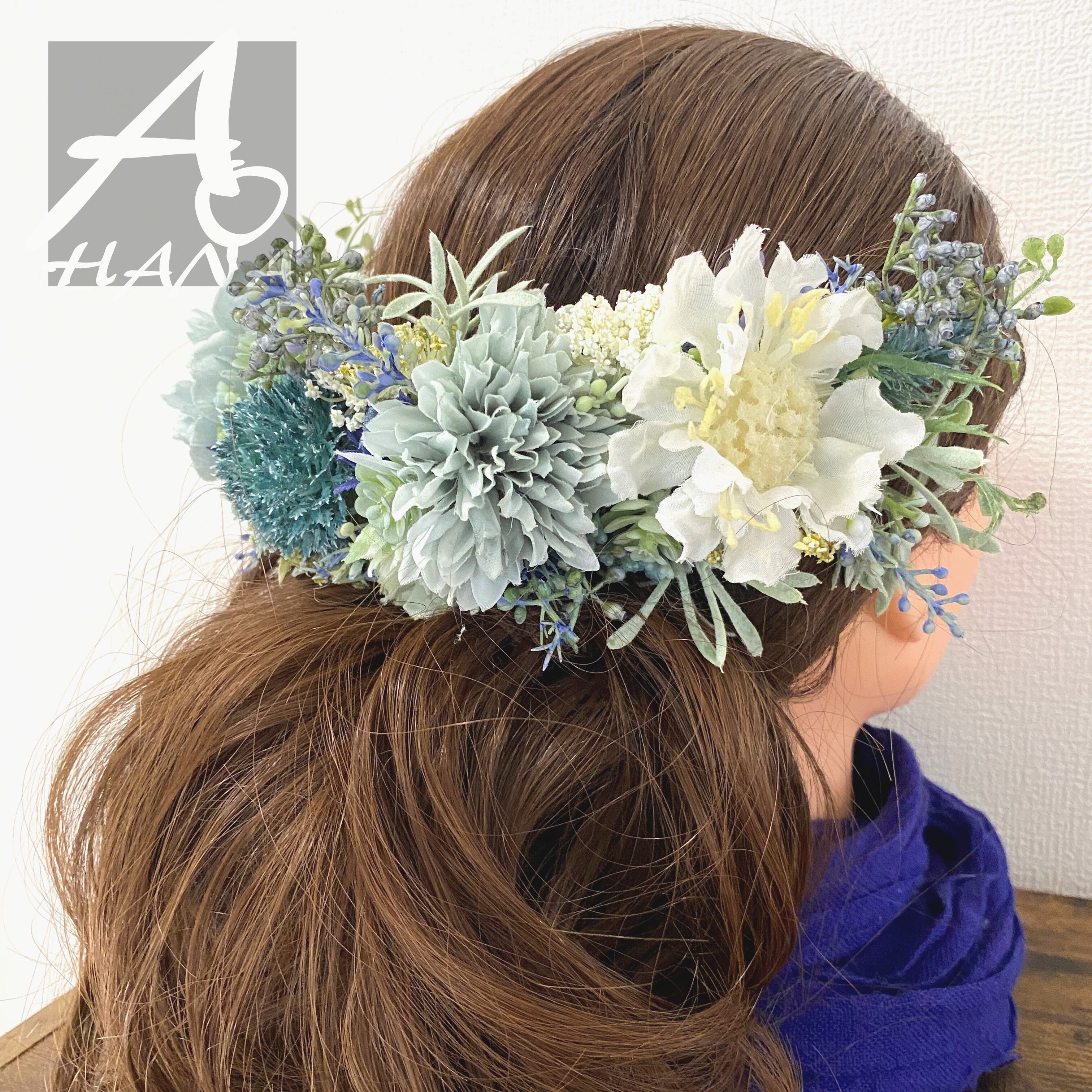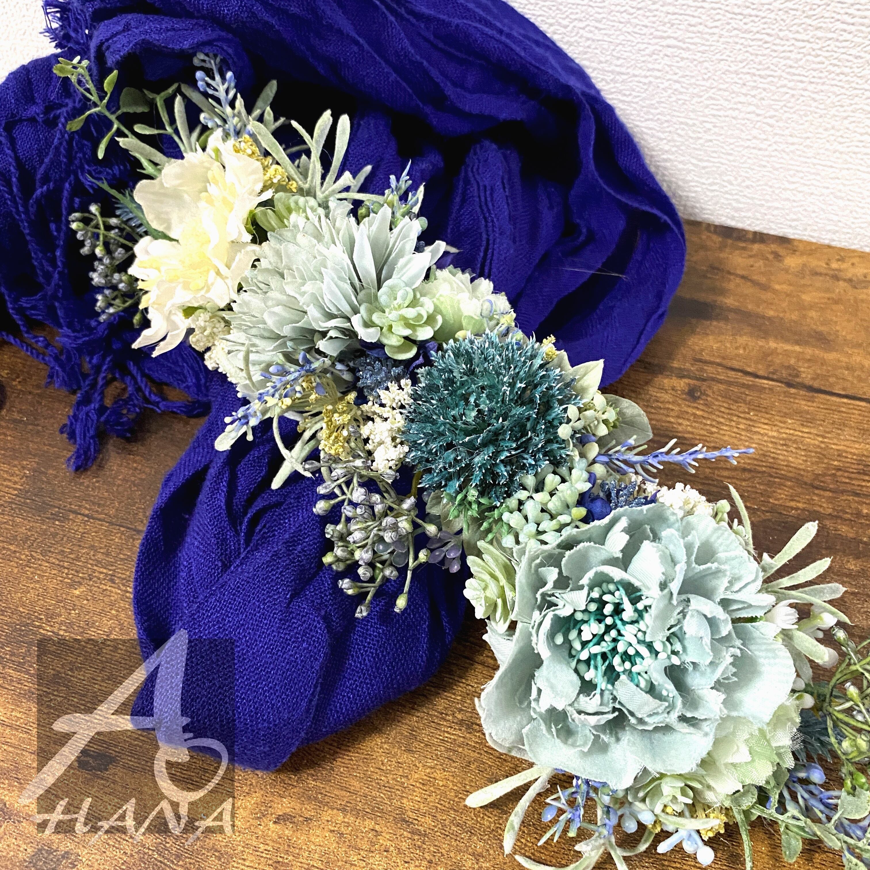 白とグレイッシュなブルー系グラデーションで仕上げた髪飾り。