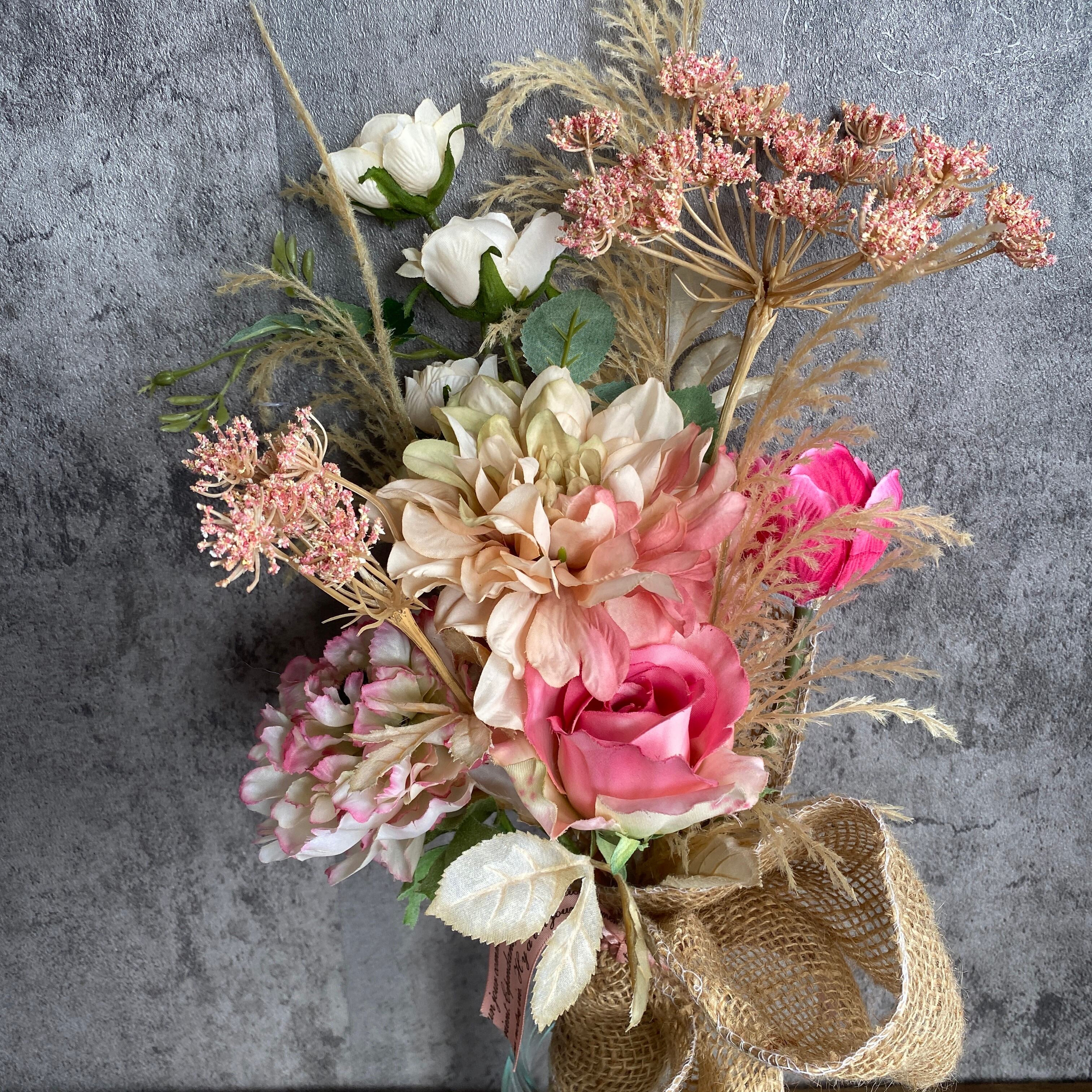 ピンク系花材で可愛らしくまとめたドライフラワー風造花のブーケです。