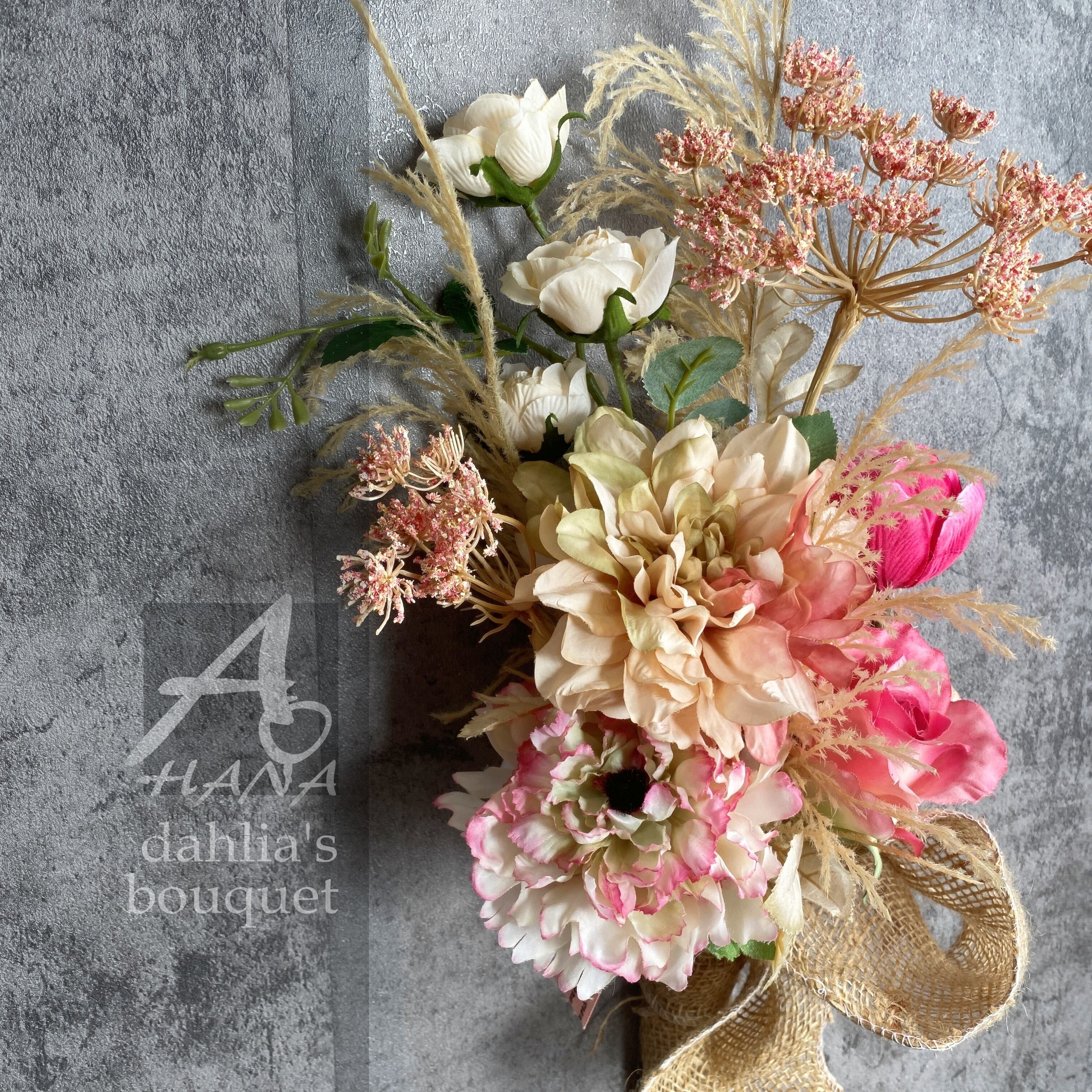 使用花材:ダリア・ピオニー・バラ・チューリップ・ドライフラワー風造花他