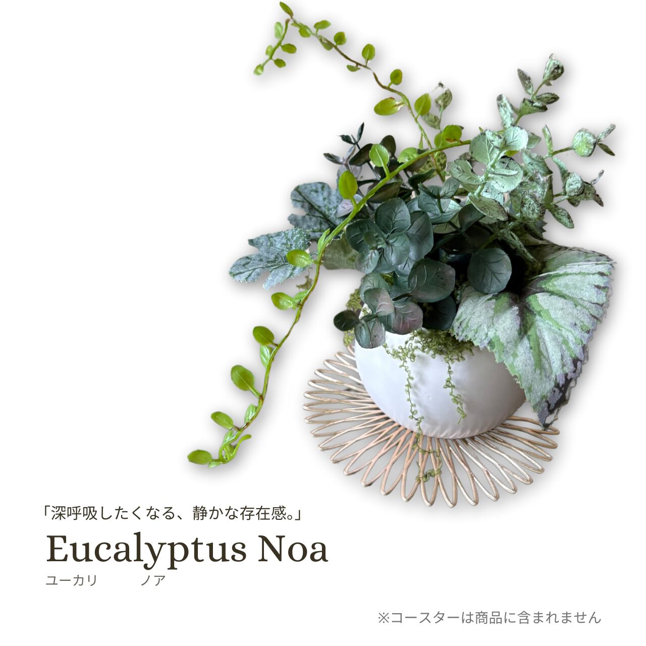 シルバーグリーンとダークグリーン、2種のユーカリが織りなす落ち着いた色調に、繊細なワイヤープランツと個性的なベゴニアリーフを添えた、深みと透明感のあるフェイクグリーンポットです。