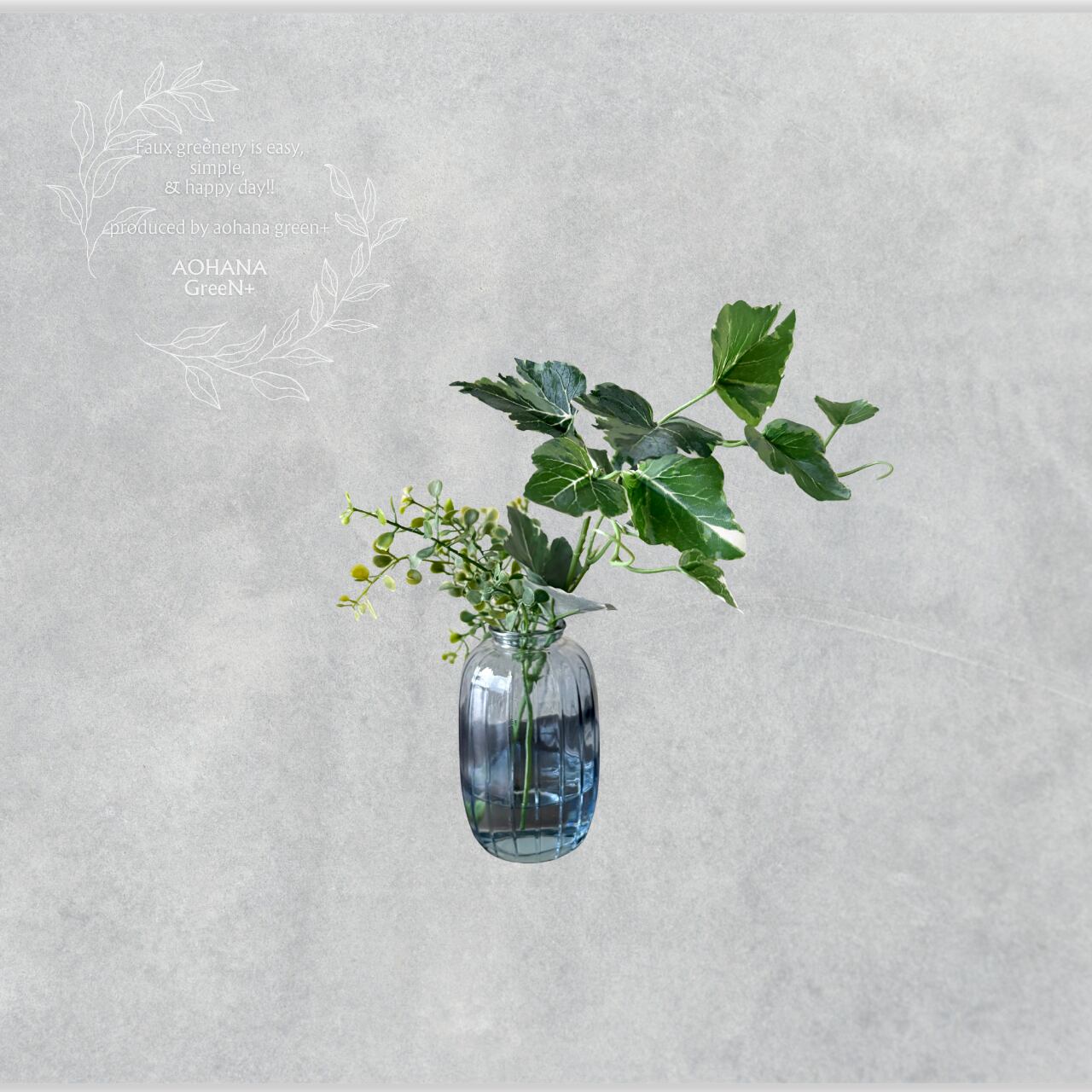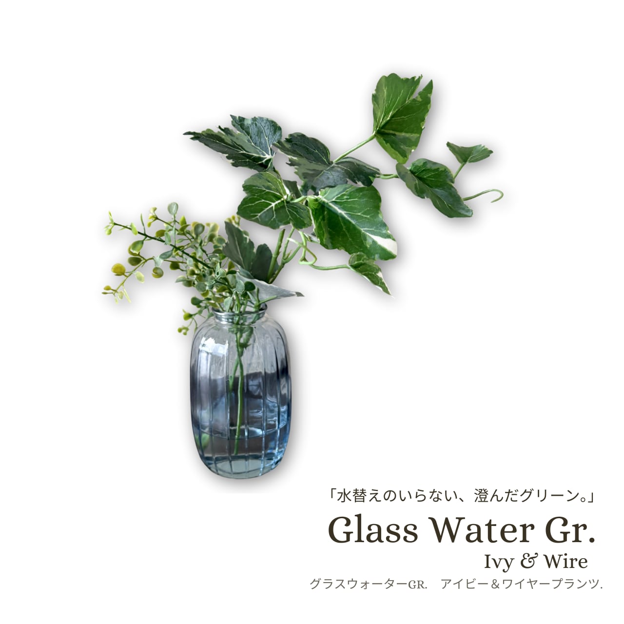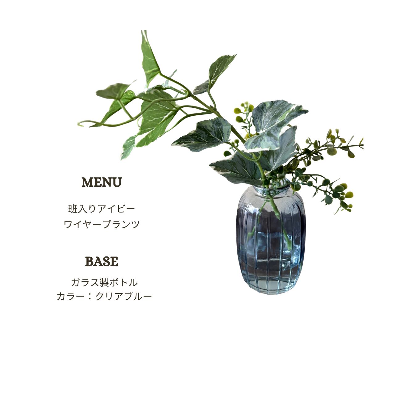 斑入りアイビーと小葉リーフを合わせた、マジカルウォーター仕様のフェイクグリーンアレンジです。