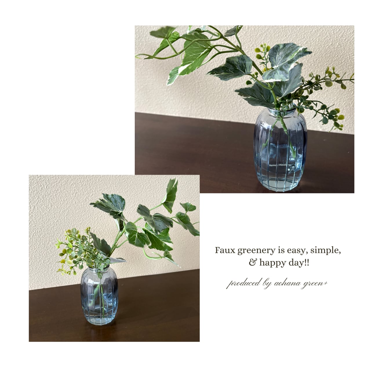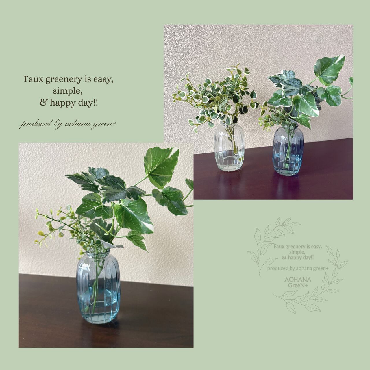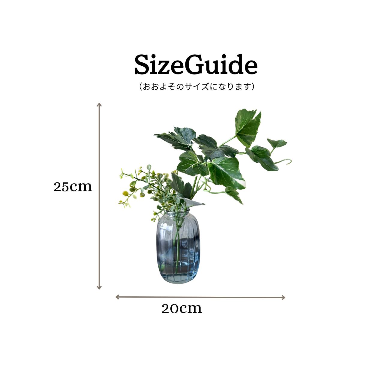 斑入りアイビーと小葉リーフを合わせた、マジカルウォーター仕様のフェイクグリーンアレンジです。
