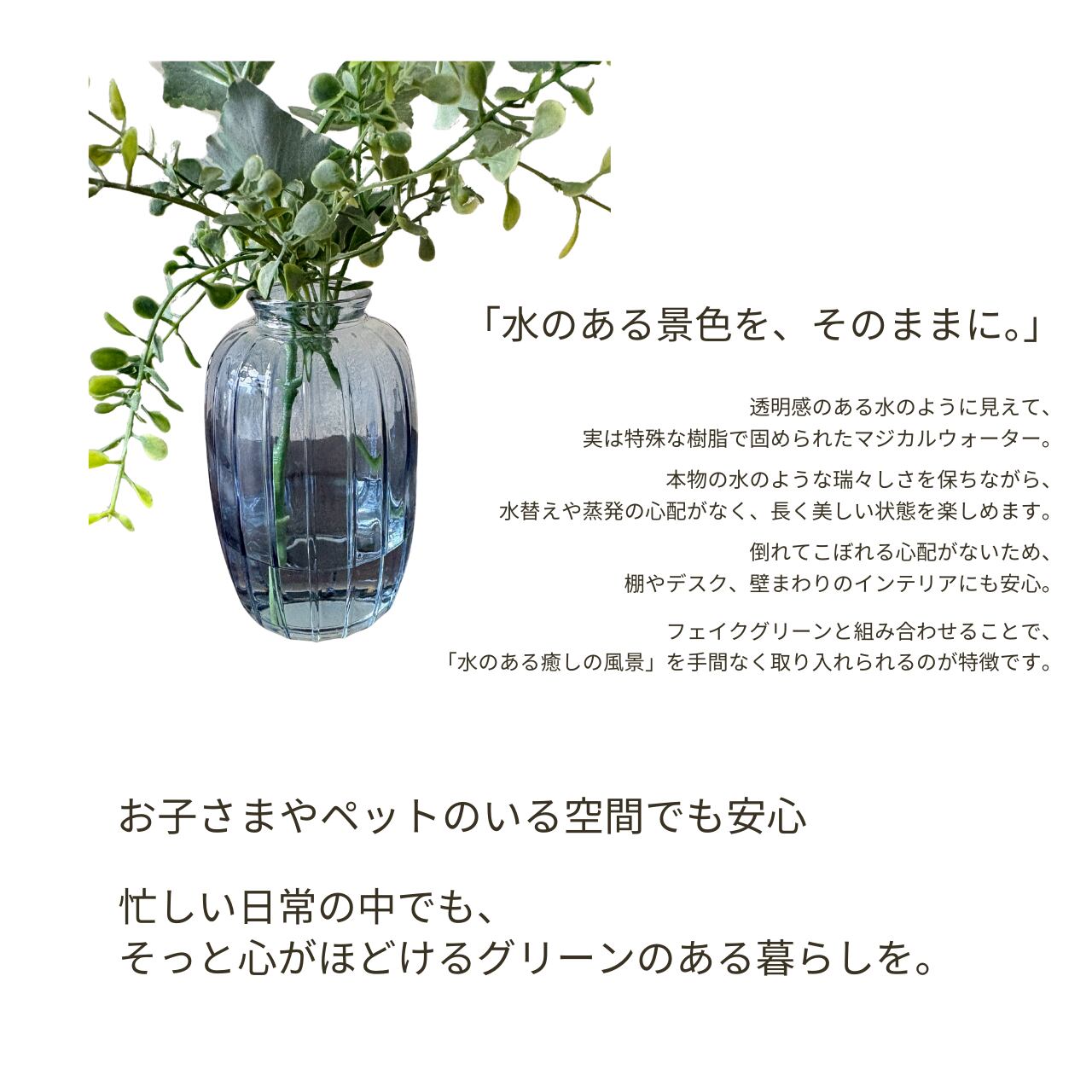 フェイクグリーンと組み合わせることで、「水のある癒しの風景」を手間なく取り入れられるのが特徴です。