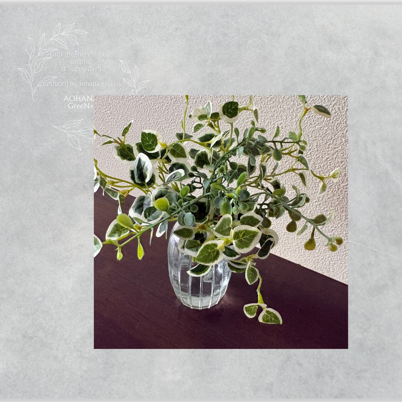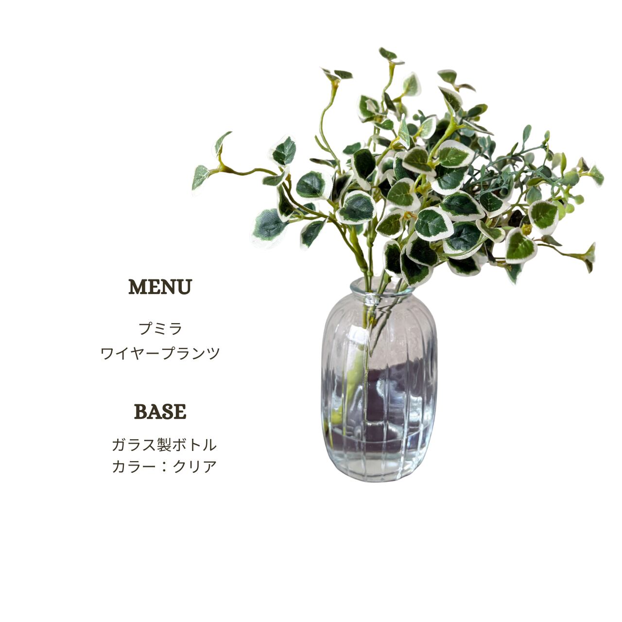 斑入りフィカス・プミラと繊細なワイヤープランツを組み合わせ、透明感のあるガラスベースに澄んだグリーンを表現しました。
