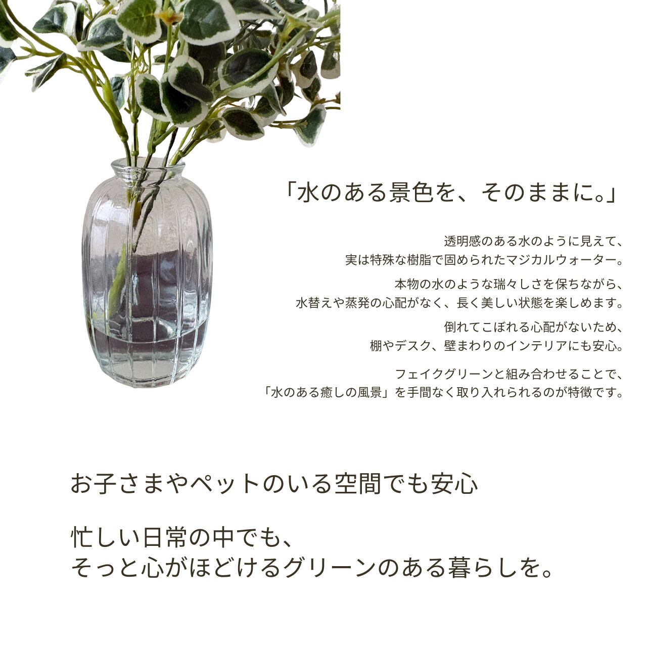 水のように見える透明な樹脂が、みずみずしい表情を長くキープ。水替え不要で、日々のお手入れも必要ありません。倒れても水がこぼれないため、ペットや小さなお子さまのいるご家庭でも安心して飾れるのが特長です。