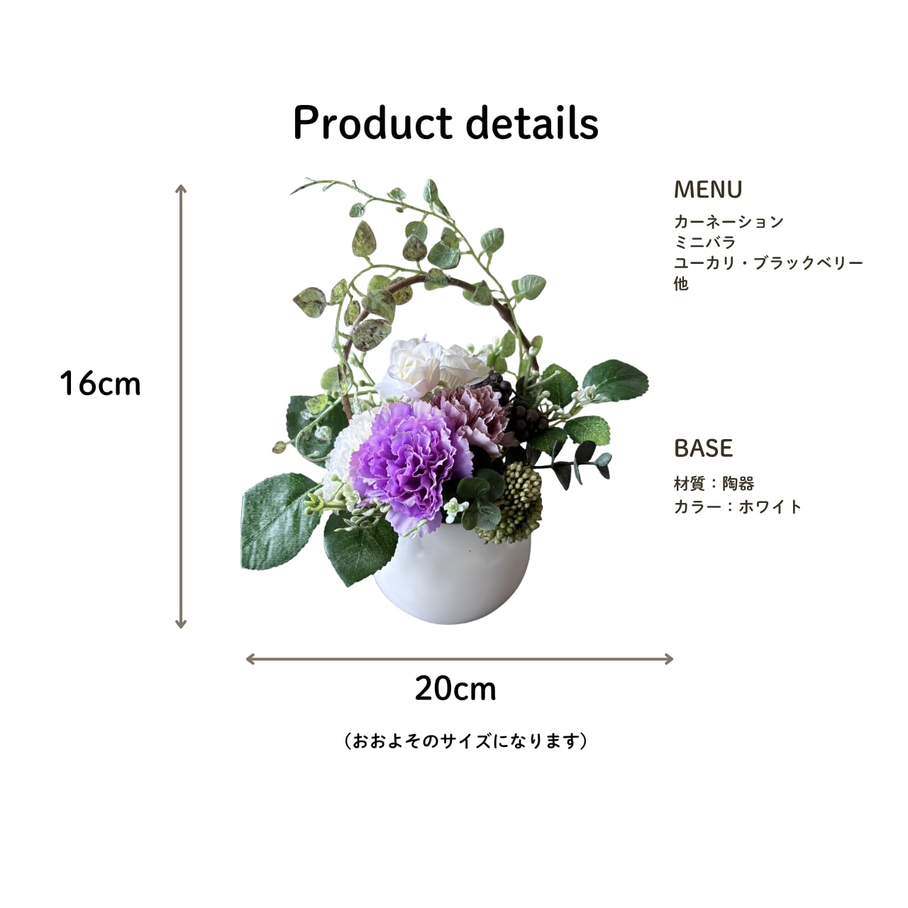 上品な紫のカーネーションと白いミニバラ、ユーカリのアーチが織りなす、大人シックなアーティフィシャルフラワーアレンジです。
